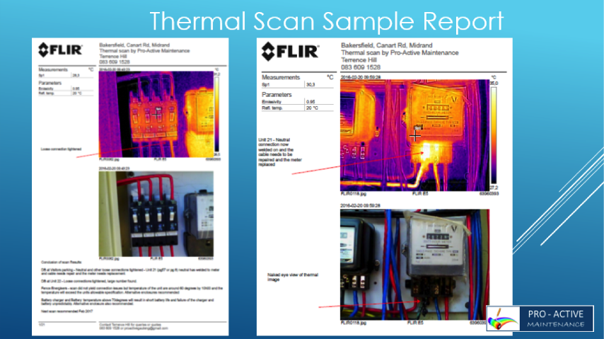 A specialist service also offered by Pro-Active Maintenance is thermal scanning of primarily electrical installation but also building scans for water services, damp and air conditioning leakages.